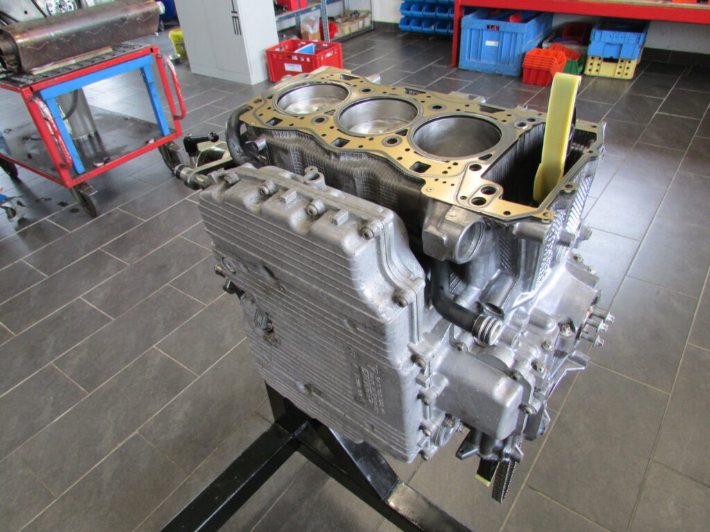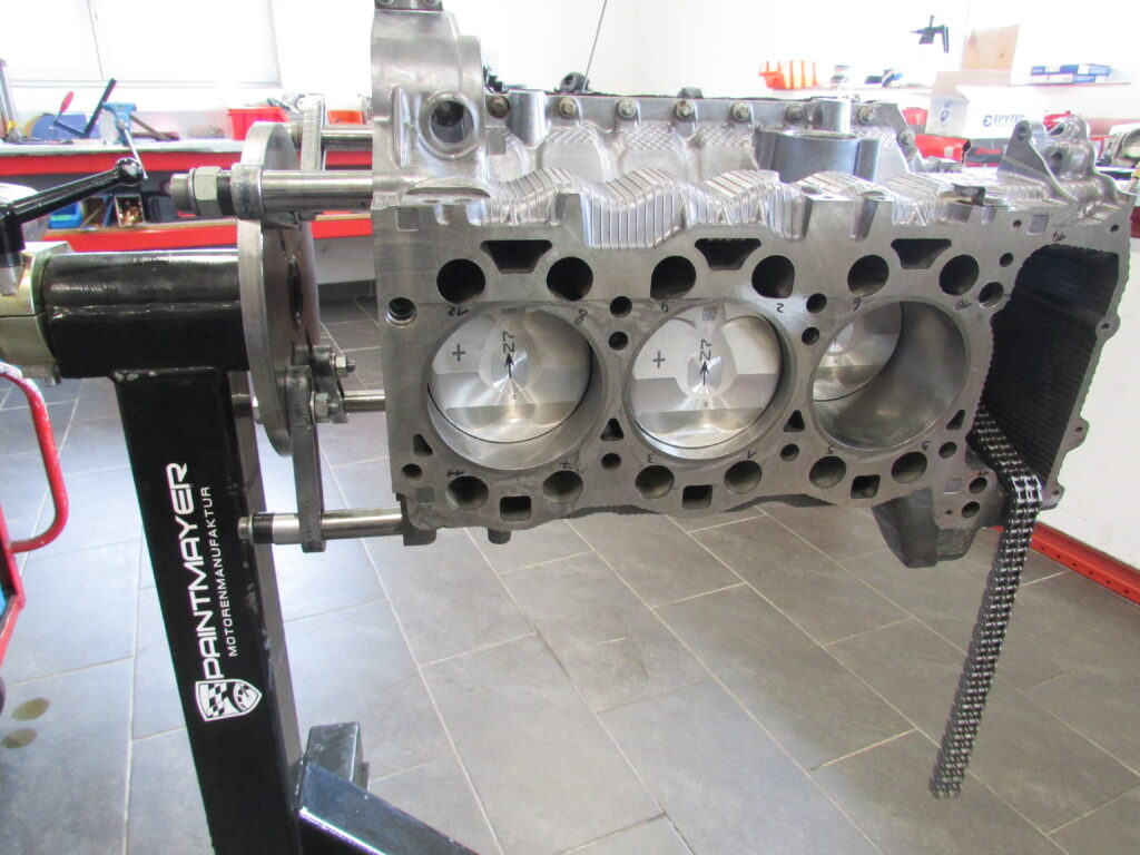 Aufgrund eines Kolbenkippers mussten wir diesen Porsche 997 Facelift Instand setzen. Der Kolbenkipper wurde durch eine Endoskopie festgestellt. Anschließend wurde der Motor komplett zerlegt, alle Teile wurden genau geprüft und gewaschen. Zur gleichen Zeit wird der Motorblock und die Zylinderköpfe in unserer hauseigenen Fräserei bearbeitet. Beim Motorblock werden die Zylinder gespindelt, die Stahlbuchsen eingesetzt und jeder Zylinder gehont. Die Zylinderköpfe werden geplant, auf Risse überprüft und die Ventilsitze nachgeschnitten und eingeschliffen, sowie die Ventile Glasperlen gestrahlt. Im Anschluss werden alle Teile wieder zusammengesetzt, selbstverständlich werden alle Verschleißteile durch Neue ersetzt. Die Zwischenwelle wurde verstiftet und mit unserem Zwischenwellenlager versehen.